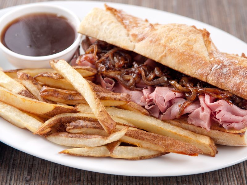 Creato a Los Angeles all’inizio del Novecento, questo sandwich combina sottili fette di manzo arrosto, pane croccante e un sugo caldo e saporito chiamato “au jus”. Nonostante il nome possa trarre in inganno, il French Dip non ha origini francesi: si deve infatti alla scena gastronomica californiana. Due storici ristoranti di Los Angeles, Philippe the Original e Cole’s Pacific Electric Buffet, si contendono tuttora la paternità dell’invenzione, attribuendola a incidenti o richieste specifiche di clienti alla ricerca di maggiore morbidezza nel panino.