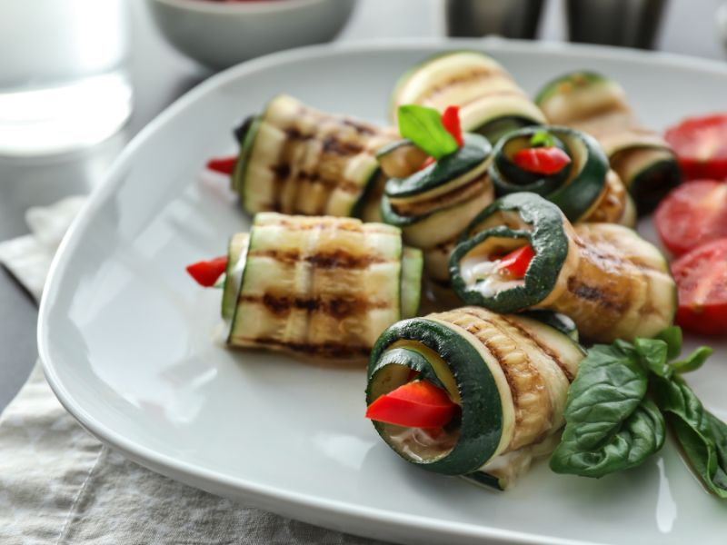 Le zucchine, affettate sottilmente per la parte più lunga, vengono grigliate per qualche minuto su una piastra rovente, condite con un pizzico di sale e farcite con formaggio spalmabile aromatizzato alle erbette e con un pomodorino. Vengono quindi arrotolate a formare l’involtino e, se necessario, infilzate con uno stuzzicadenti di legno. Non rimarrà che profumarle con del pepe nero macinato al momento e bagnarle con un filo d’olio.