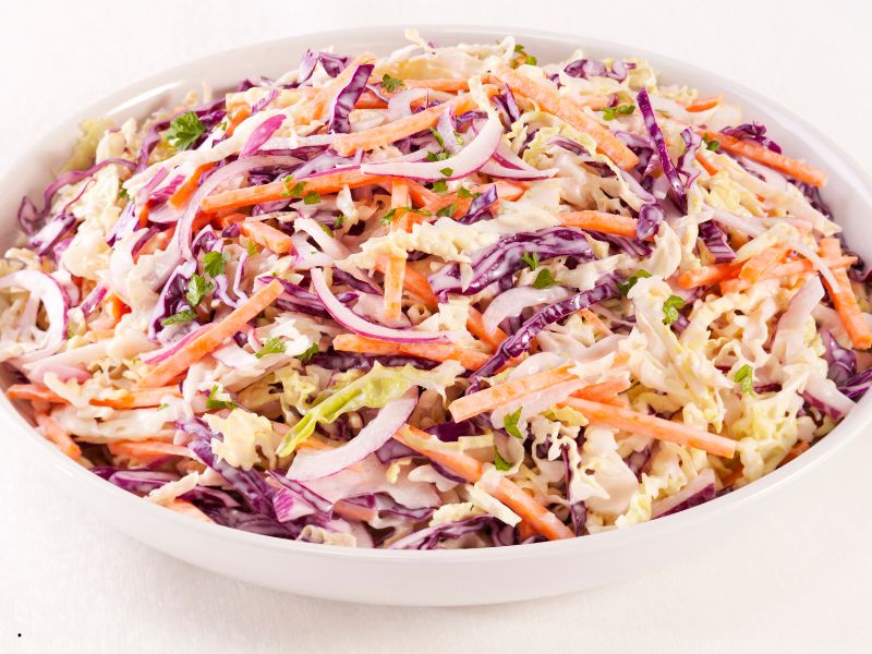 La coleslaw, la famosa insalata di cavolo cappuccio, è un classico contorno americano. Tuttavia, esistono molte varianti in tutto il mondo di questa ricetta, con ingredienti e condimenti che variano. Oltre al classico cavolo e carote, si possono trovare versioni con cipolla, uva, mele, pollo, aneto e menta. Anche il condimento può variare: oltre alla classica maionese, si possono usare panna e senape, o una semplice combinazione di aceto e olio d’oliva.