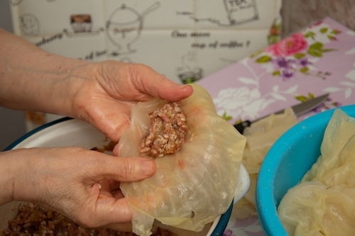 Si passa all’assemblaggio degli involtini. Su ogni foglia di cavolo, si pone una porzione di ripieno e si arrotola la foglia attorno ad esso, formando degli involtini stretti e compatti.