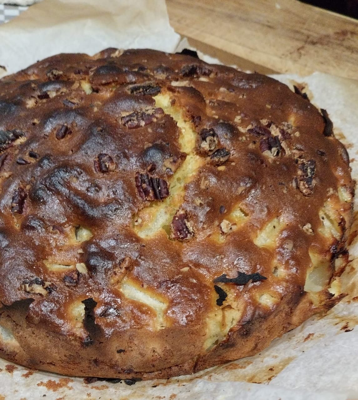 Adesso potete scegliere come lavorare la nostra torta, dalla frusta a mano alla planetaria va bene tutto. Inseriamo però gli ingredienti in ordine, uno alla volta. Sbattiamo le uova con lo zucchero, aggiungiamo poi lo yogurt, l’olio, il latte e la farina, un pizzico di sale e la cannella. Quando gli ingredienti saranno ben amalgamati, aggiungiamo il lievito in polvere e versiamo il composto nello stampo con pere e cioccolato e mescoliamo grossolanamente. A questo punto, sbricioliamo le noci pecan e mettiamole sulla torta appena prima di infornarla, in forno già caldo a 180 gradi per 50/60 minuti.